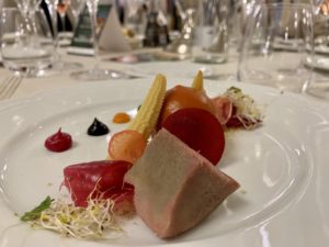 - Geometria di lingua di Chianina, petali di cipolla, radici, pannocchie baby, kimchi di zucca, mayo alla rapa rossa, salsa verde, gel di mirtilli, crumble di capperi (chef Lorenzo Pisini)