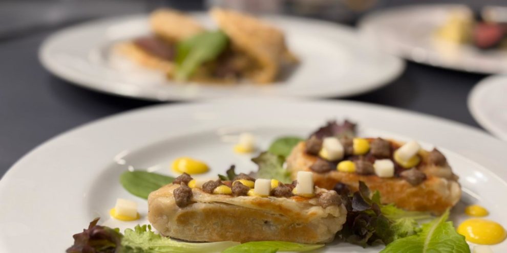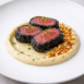 Filetto di vitellone Bianco dell’Appennino Centrale IGP in tempura nera, purè con patate rosse di Colfiorito IGP, gel di lime e nocciole tostate
