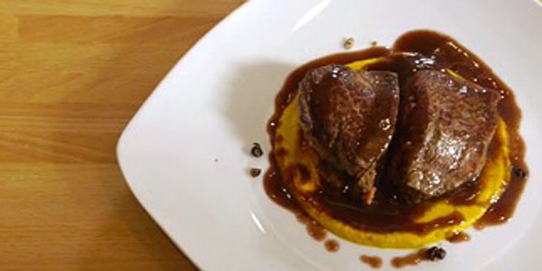In una padella con olio extravergine di oliva, aglio in camicia, rosmarino e scalogno cuocere il filetto di Vitellone Bianco dell’Appennino Centrale aggiungendo un pizzico di sale. Nel frattempo aggiungere un po’ di acqua di cottura delle carote alla pentola con il vino rosso e il fondo bruno.