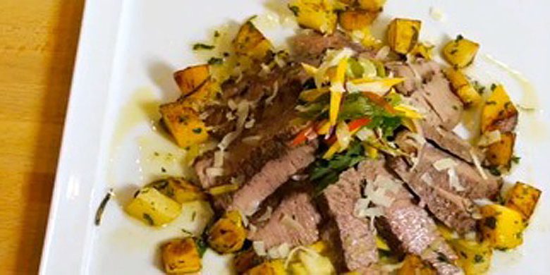 Comporre il piatto ponendo alla base l’insalata, adagiandovi sopra lo Scamone di Vitellone Bianco dell’Appennino Centrale tagliato a fettine e decorare con patate, mango e con il pecorino toscano grattugiato.